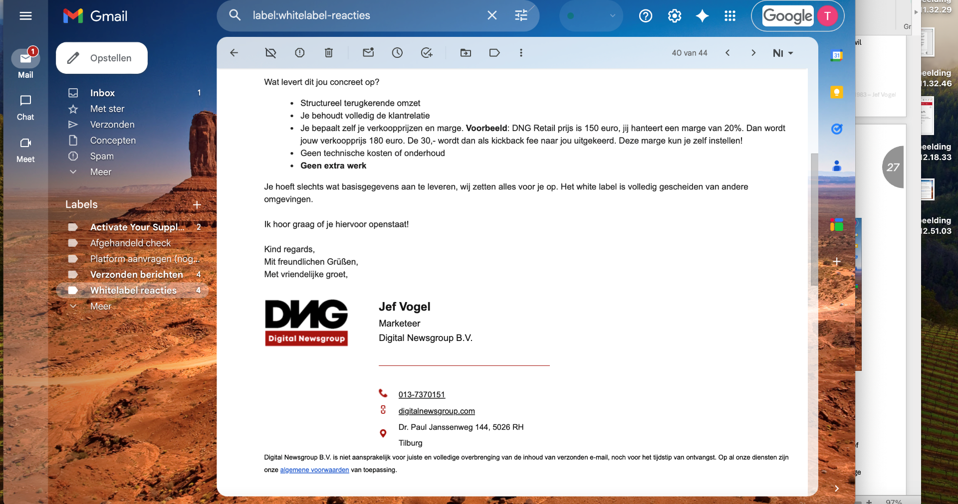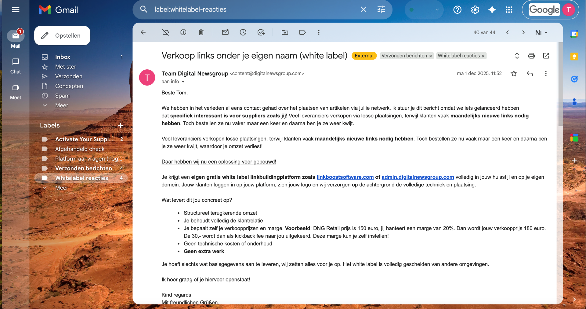 Op basis van mijn leerdoel wilde ik actief potentiele B2B-partners benaderen die mogelijk interesse hebben in onze white-label linkbuildingsoftware. Mijn doel was om te toetsen of het aanslaat, om gesprekken op gang te brengen en om minimaal een sales meeting te realiseren. Ik koos bewust voor bestaande leveranciers en agencies binnen DNG die al actief zijn met linkbuilding, omdat zij direct voordeel kunnen halen uit schaalbaarheid en de automatisering. Voor de benadering heb ik een salesmail opgesteld waarin ik; het probleem duidelijk benoem, handmatige plaatsingen, tijdverlies en schaalproblemen. Ook heb ik in de mail onze white-label geïntroduceerd als de oplossing. In de mail heb ik geprobeerd te zorgen dat de focus ligt op waarde en samenwerking en niet op directe verkoopt.