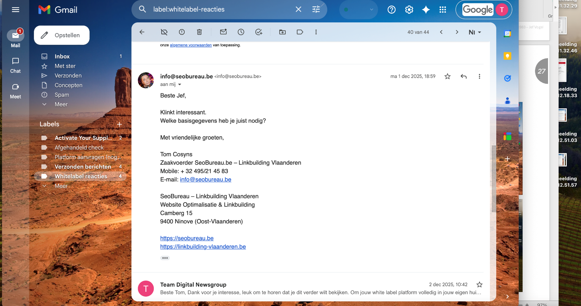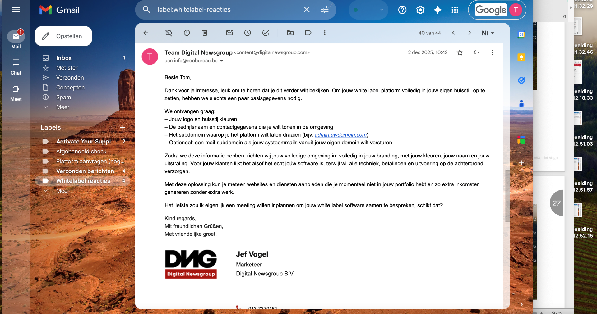 Ik heb meerdere potentiele partners benaderd via de e-mail. Uit deze outreach kwamen verschillende reacties voort, variërend van interesse tot inhoudelijke vragen en verzoeken om meer informatie. Enkele partijen, vroegen specifiek welke gegevens nodig waren om een White-label omgeving op te zetten, wat voor mij een duidelijk signaal was dat de propositie aansloeg. Op basis van deze reacties heb ik vervolgmails gestuurd en een concrete meeting ingepland met een geïnteresseerde partij. Tijdens dit gesprek heb ik onze White-label software toegelicht en ruimte gelaten voor de klant om zijn eigen werkwijze en uitdagingen te delen. De klant gaf aan dat hij al werkt met een grotendeels geautomatiseerd content en publicatiesysteem en benoemde zelf hoeveel tijd en handmatig werk dit hem bespaart.