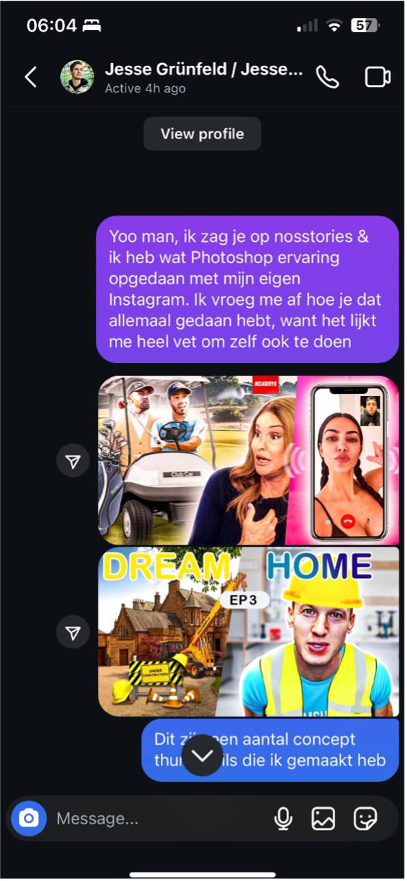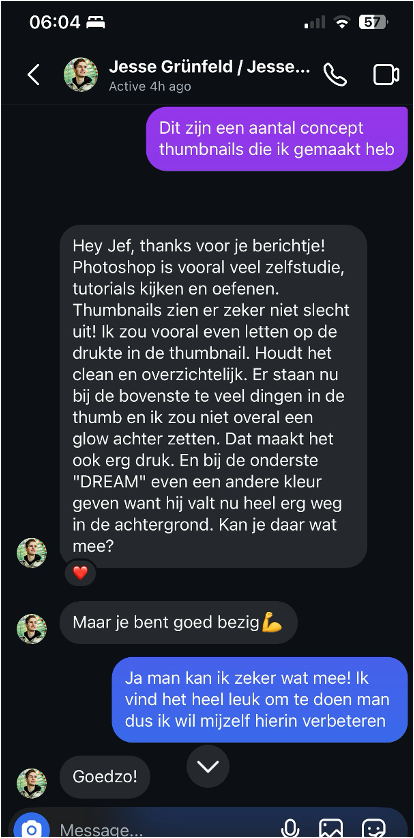 Het maken van thumbnails via Photoshop werd gestructureerd aangepakt met de PDCA-cyclus. In de Plan-fase lag de focus op het creëren van visueel aantrekkelijke en relevante thumbnails die de click-through rate verhogen. Dit werd uitgevoerd met Photoshop-tools zoals belichtingseffecten, schaduwen en contrastaanpassingen. In de Do-Fase zijn meerdere ontwerpen getest en aangepast op basis van peer-feedback. Analyse in de check-fase toonde aan dat ik minder drukke thumbnails moest maken van Jesse (Bijlage U). Dit algehele proces heeft geleid tot een systematische verberering van de kwaliteit van thumbnails, wat essentieel is voor zowel persoonlijke projecten als professioneel gebruik, met directe voordelen voor hogere CTR's en merkconsistentie.