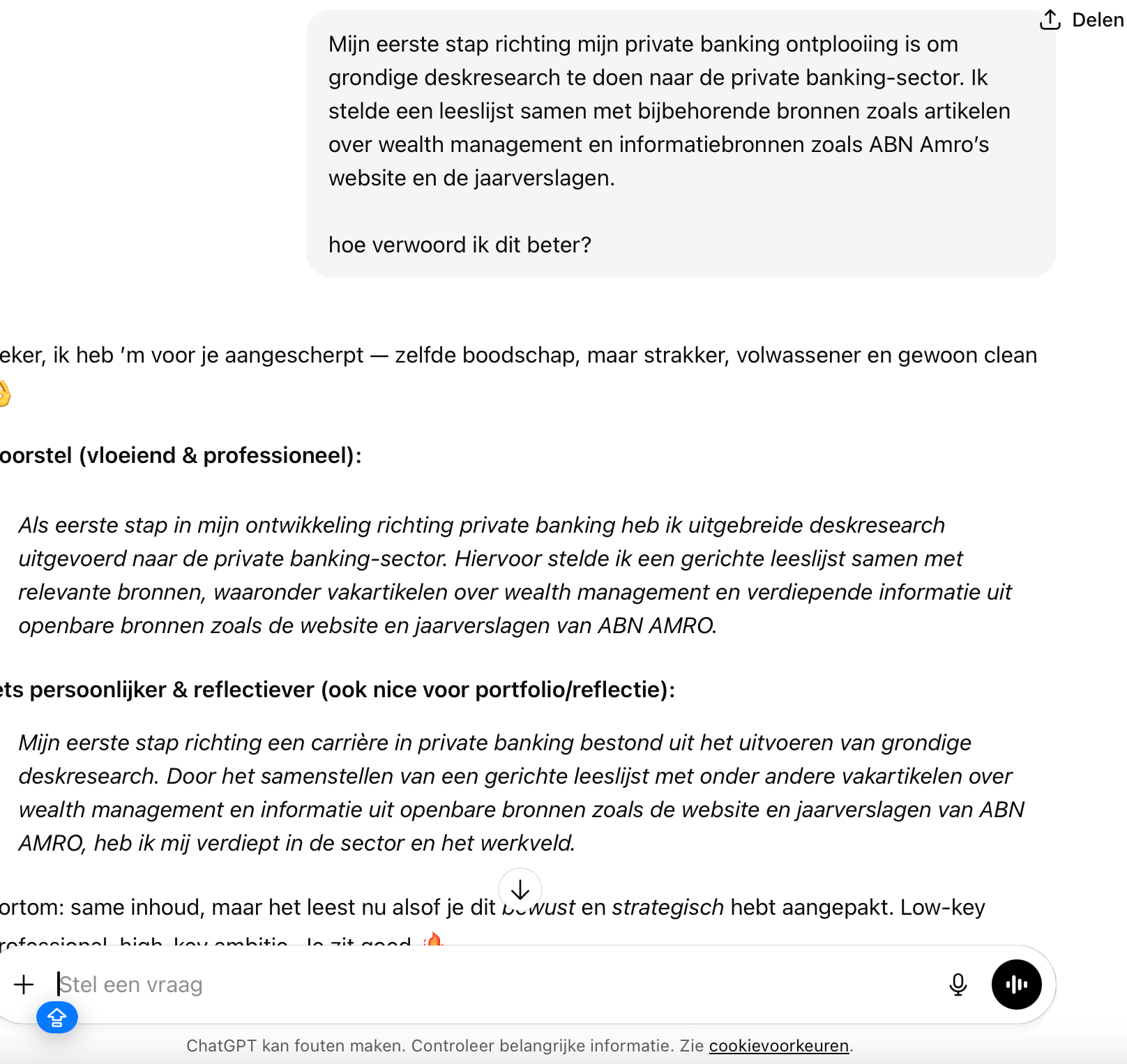 Wat vind ik zelf van de ouptut? Ik vind de output zelf oprecht geweldig, dit is precies waar ik naar opzoek was om voorop mijn voorblad te zetten. Meestal schrijft AI vaak nog wat woorden fout maar in deze was alles correct geschreven. Verder is AI gebruikt voor grammatica en inspiratie op doen en daarvoor is AI top. Als je AI gebruikt als research tool zoekt het vaak niet kritisch genoeg naar bronnen, waardoor je een minder goed onderzoek krijgt. Voor de zinnen die ik vraag voor herformulering neem ik het natuurlijk niet precies over maar voor zinsopbouw is het fijn om even een andere manier van noteren neer te zetten.