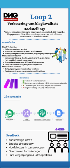 Voor de deelfase zijn de voorlopige resultaten gepresenteerd aan het team van DNG tijdens een interne maandagmeeting. Er is tijdens deze maandag meeting ruimte voor iedereen om te laten zien waar ze mee bezig zijn, ten is er gekozen om de vooruitgang van het actieonderzoek te presenteren doormiddel van een infographic. Ter ondersteuning was er ook in de praktijk laten zien hoe een make.com scenario werkt. De infographic laat zien waar de automatisering op dit moment staat en waar nog verbeterd kan worden (Bijlage Y).