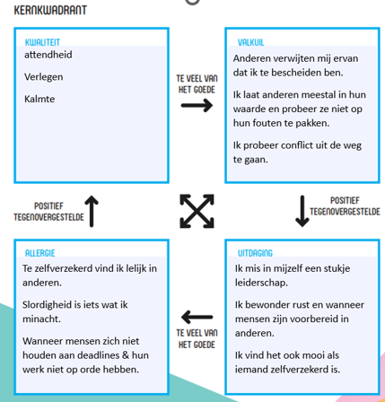 Kernkwadrant 2: Verlegen is een kwaliteit maar hierdoor kan ik anderen vaak geen feedback geven, omdat ik ze in hun waarde wil laten. Ik bewonder het wanneer iemand voorbereid is en heb daarom een allergie voor slordigheid.